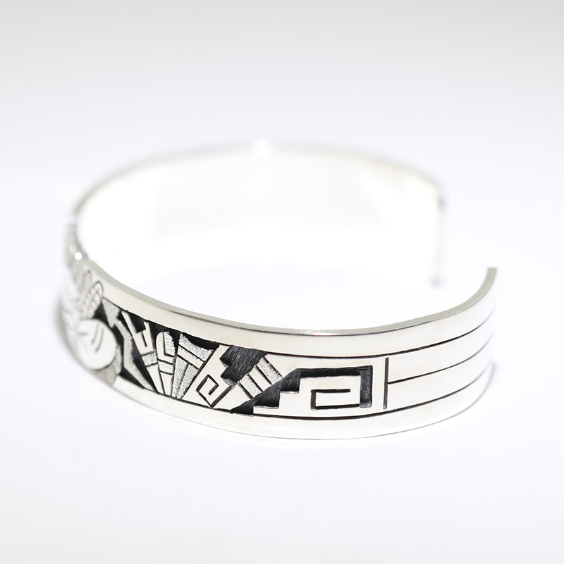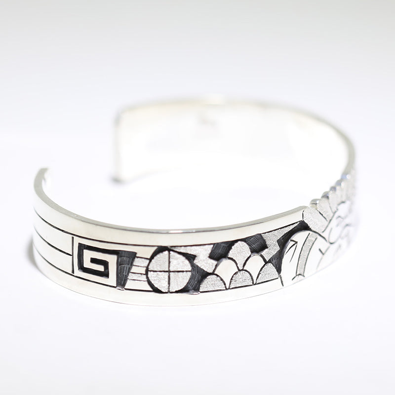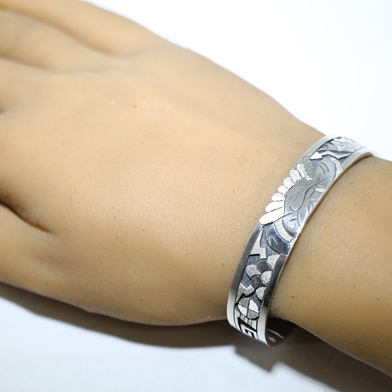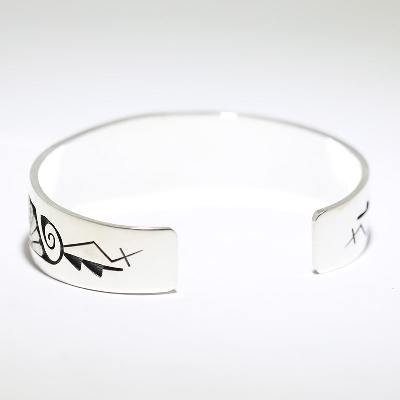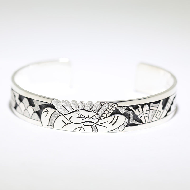 Beautiful sterling silver bracelet is done in the overlay method and features a Rattlesnake in the center.