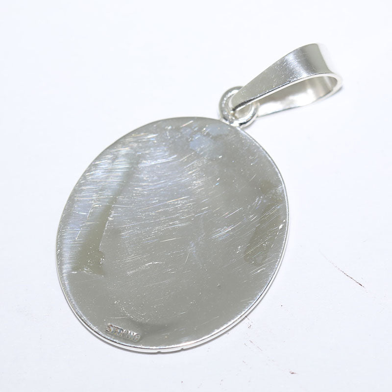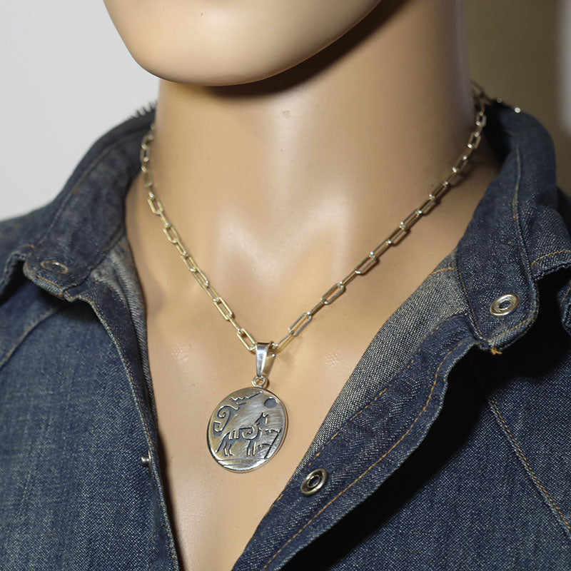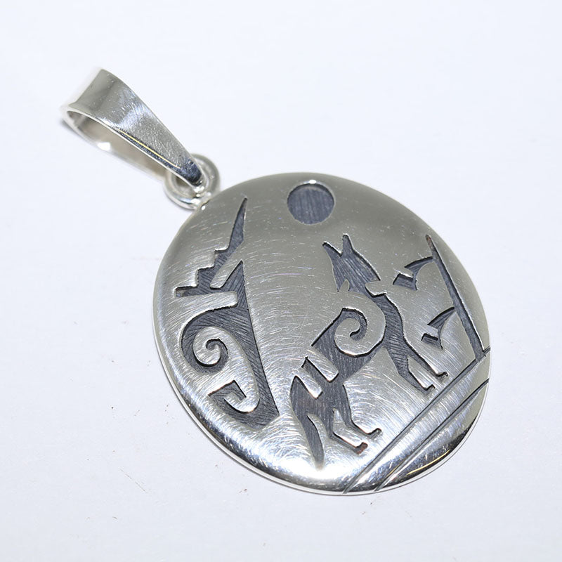 Sterling silver pendant is done in the overlay method and depicts a Wolf howling at the moon.