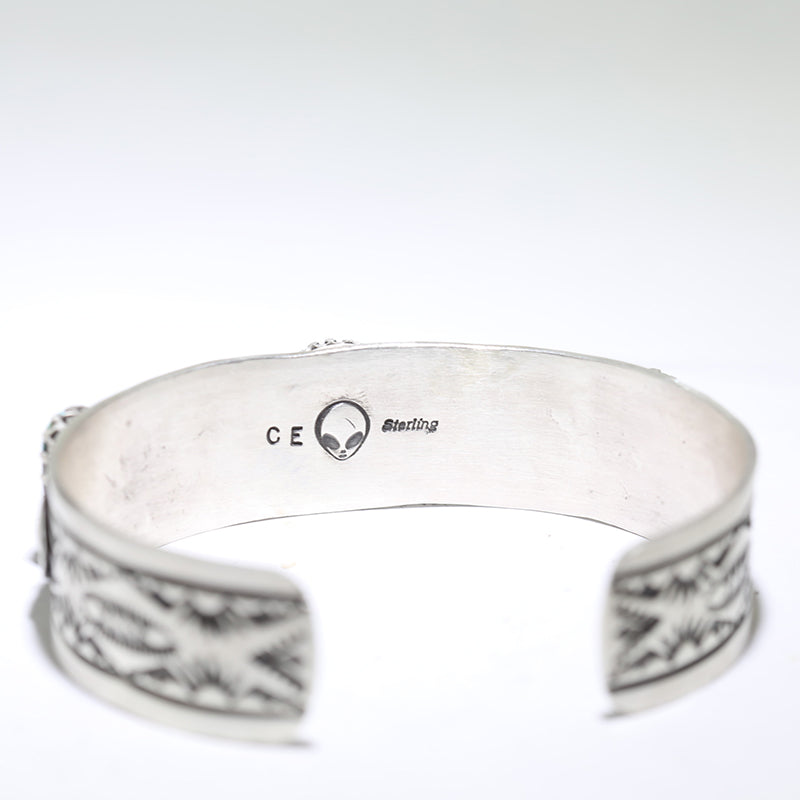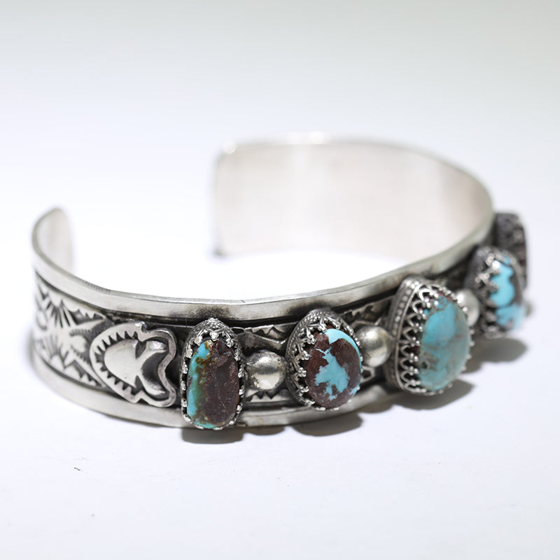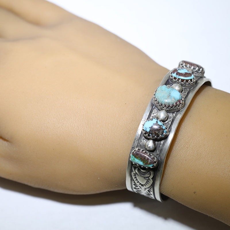 Sterling silver bracelet is set with natural Bisbee Turquoise stones along the band with a silver bead between each stone.