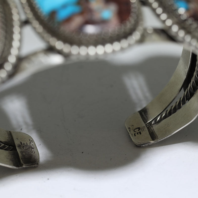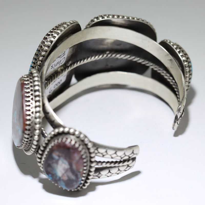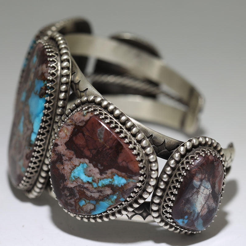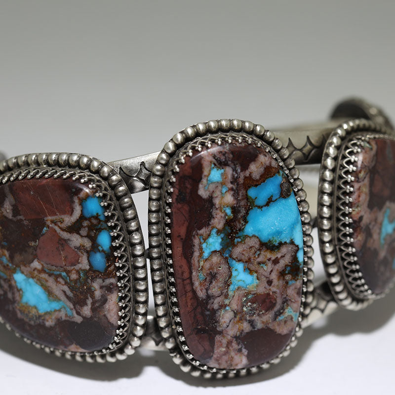 Large, sterling silver bracelet is set with five large Natural Bisbee Turquoise stones.