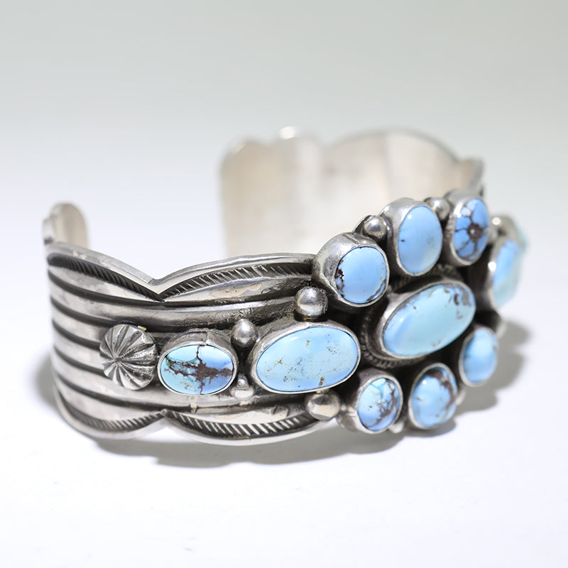 Sterling silver bracelet features a cluster type design which is set with Golden Hill Turquoise stones.