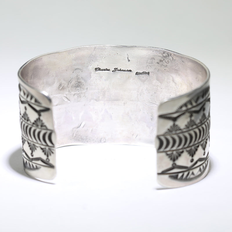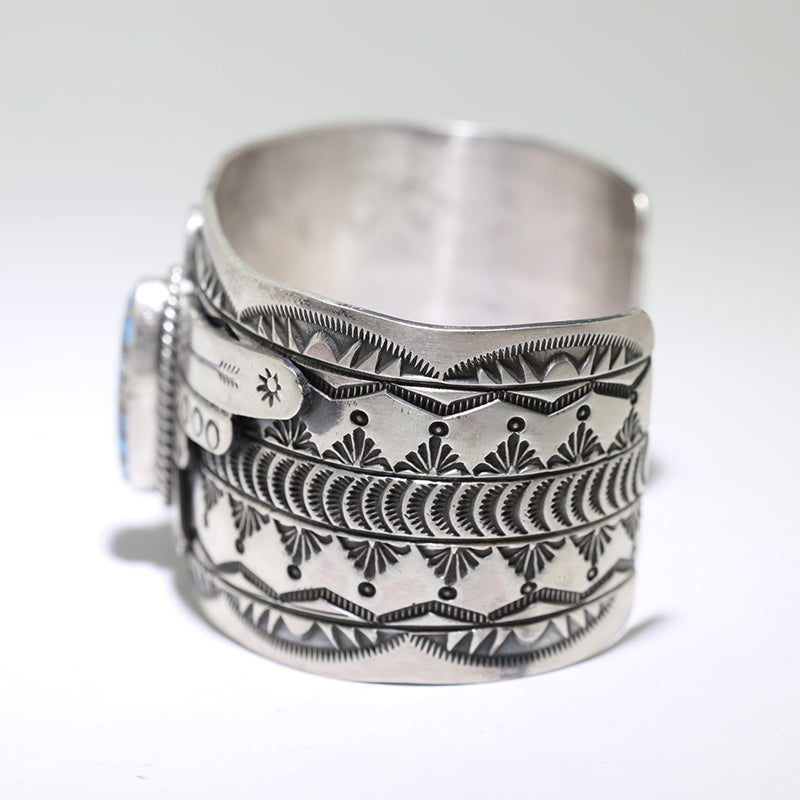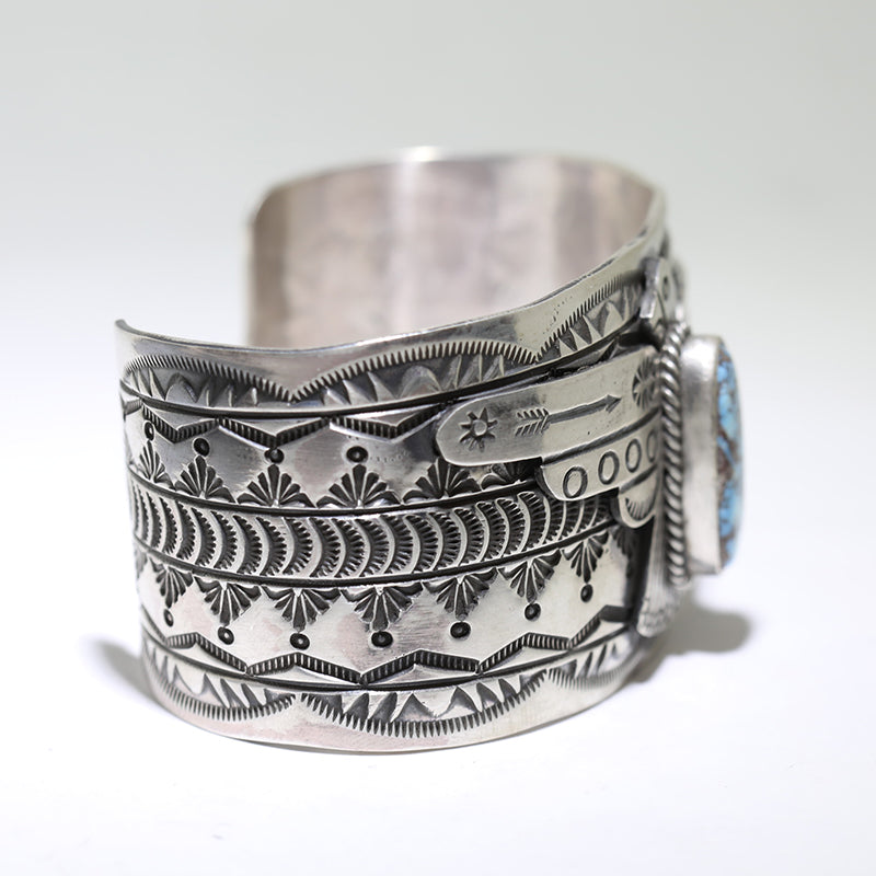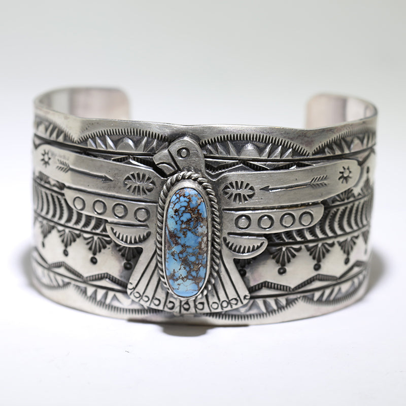 Sterling silver bracelet features the Thunderbird with beautiful hand stamped designs which is set with Golden Hill Turquoise.