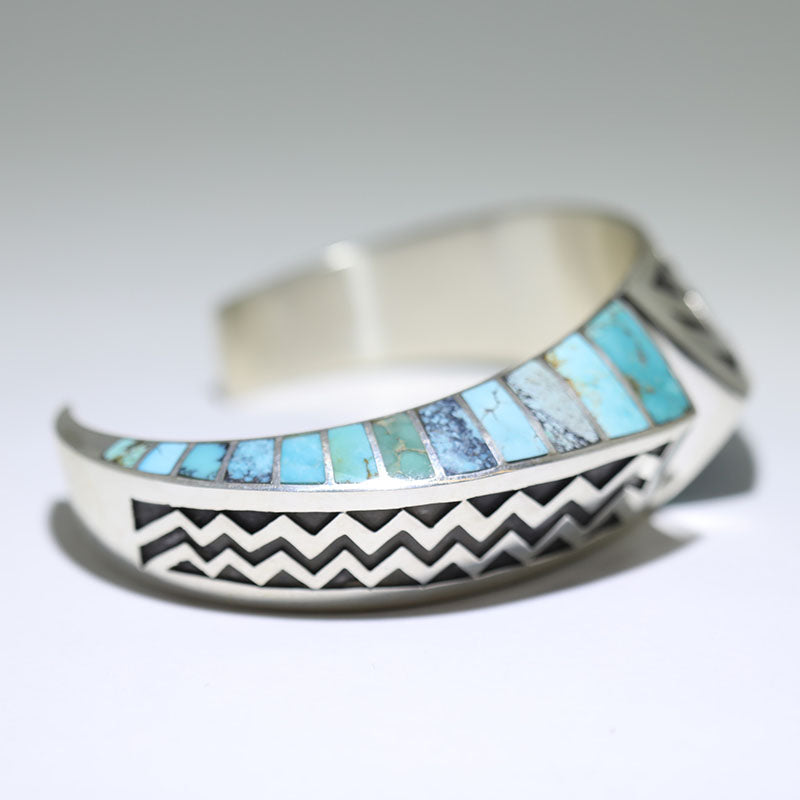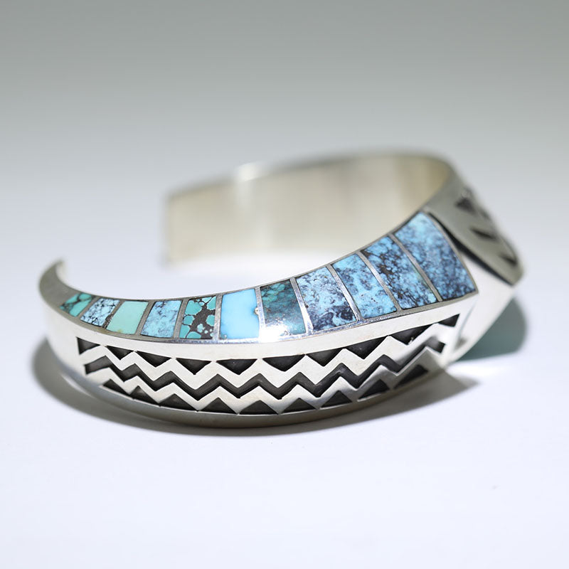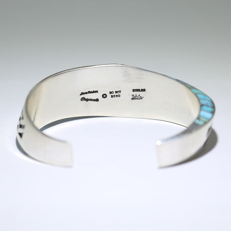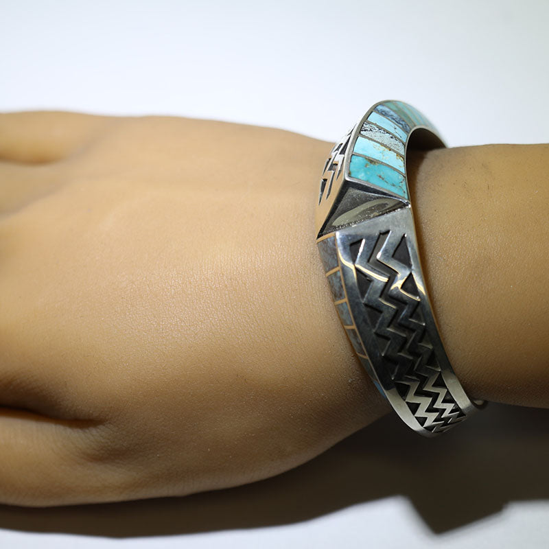 Sterling silver bracelet features overlay designs and is inlaid with Chinese Turquoise stones on both sides of the bracelet.