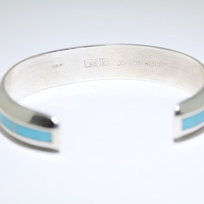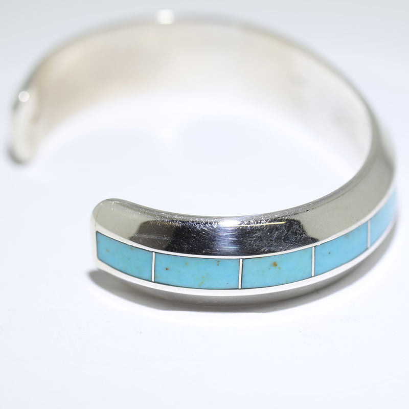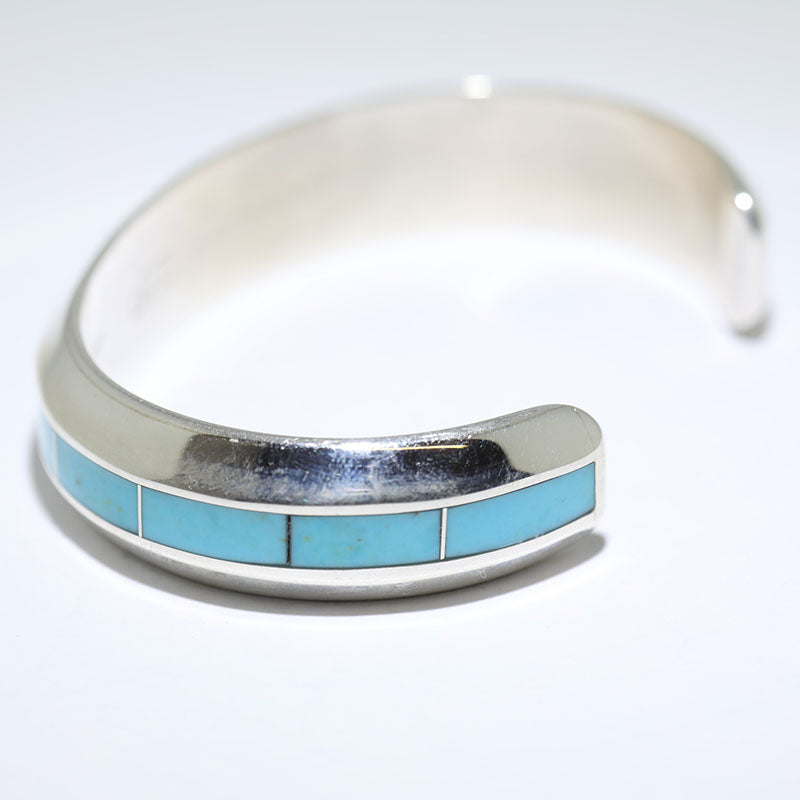 Sterling silver bracelet is inlaid with Turquoise stones along the center with shiny silver edges.