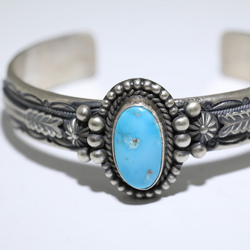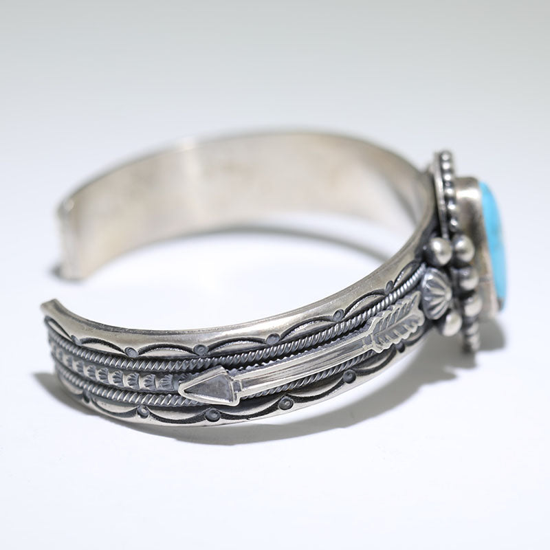 Sterling silver bracelet features hand stamped designs and is set with Natural Kingman Turquoise with an arrow on each side of the stone.