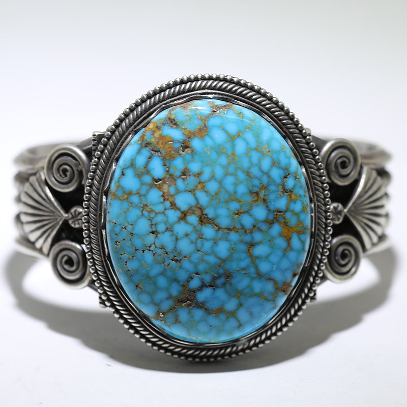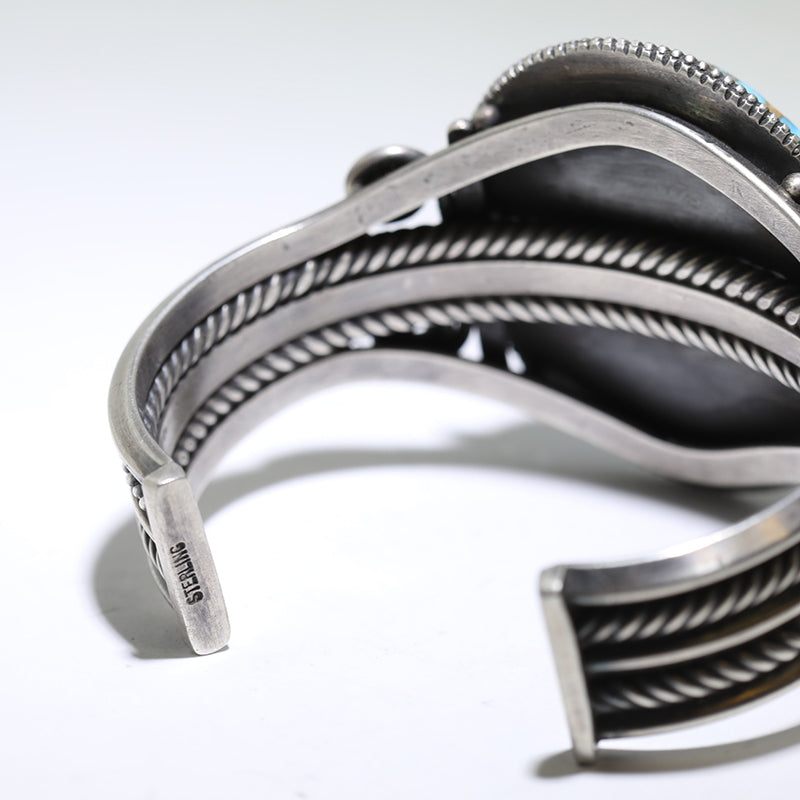 Sterling silver bracelet is set with a large, round Kingman Turquoise stone which is surrounded by both twist wire and bead wire. The stone is directly from Kingman mine, which is hand cut by Steve himself. The shank of the bracelet features beautiful silver work and shells on each side of the stone.