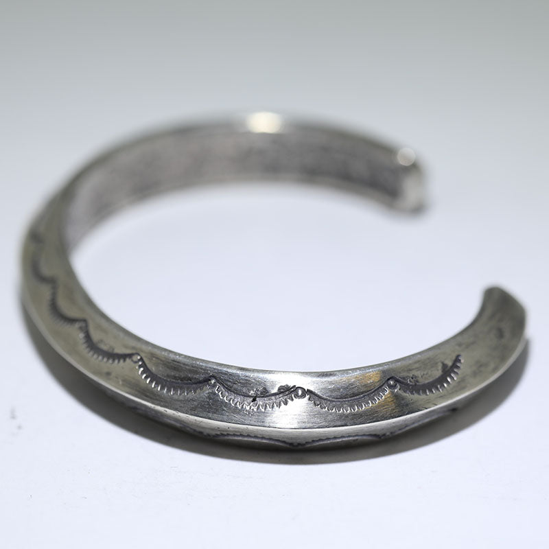 Coin silver bracelet features hand stamped designs along the band.