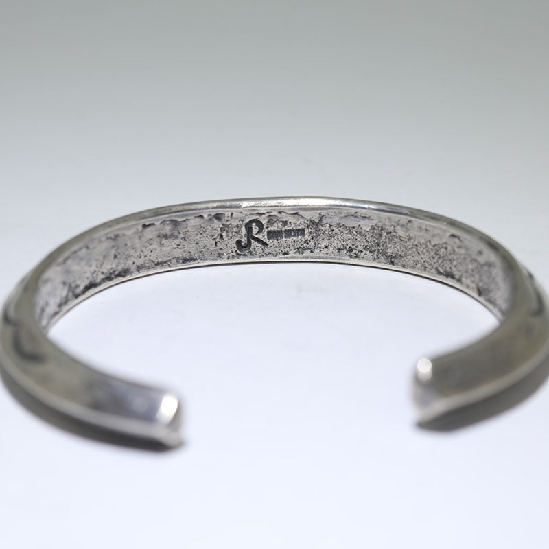Jesse's work starts with old U.S. coins and a hand-carved tufa mold. The coins are melted down into an ingot and hand wrought. From the prepared ingot he carefully stamps, files, and finishes the metal work. Much of his work is finished with hand-cut stones including turquoise, spiny oyster, sugilite, Acoma jet, and coral. |