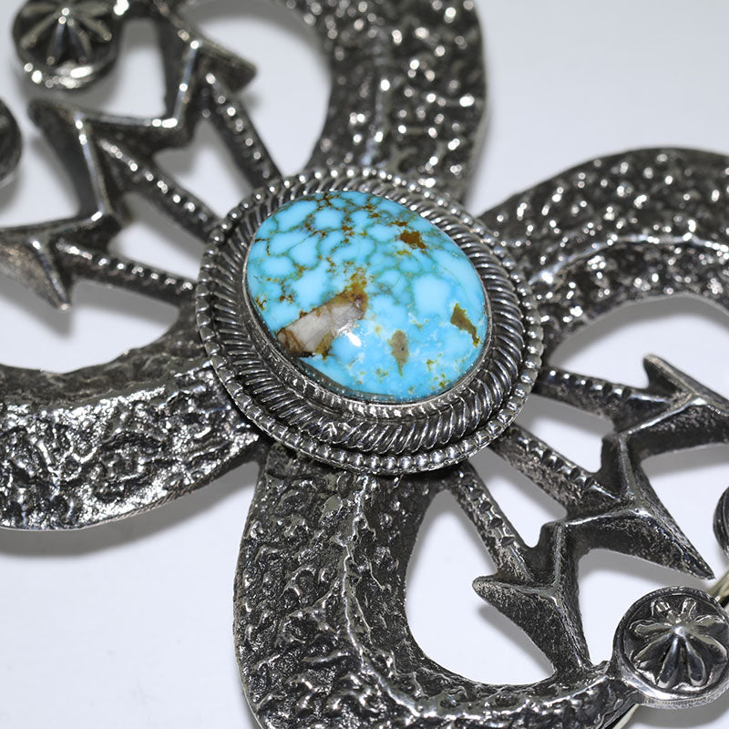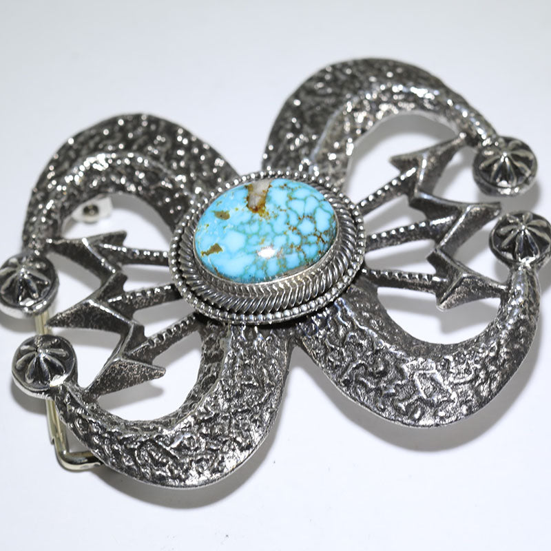 Sterling silver buckle features a beautiful design and is set with Stabilized Kingman Turquoise.
