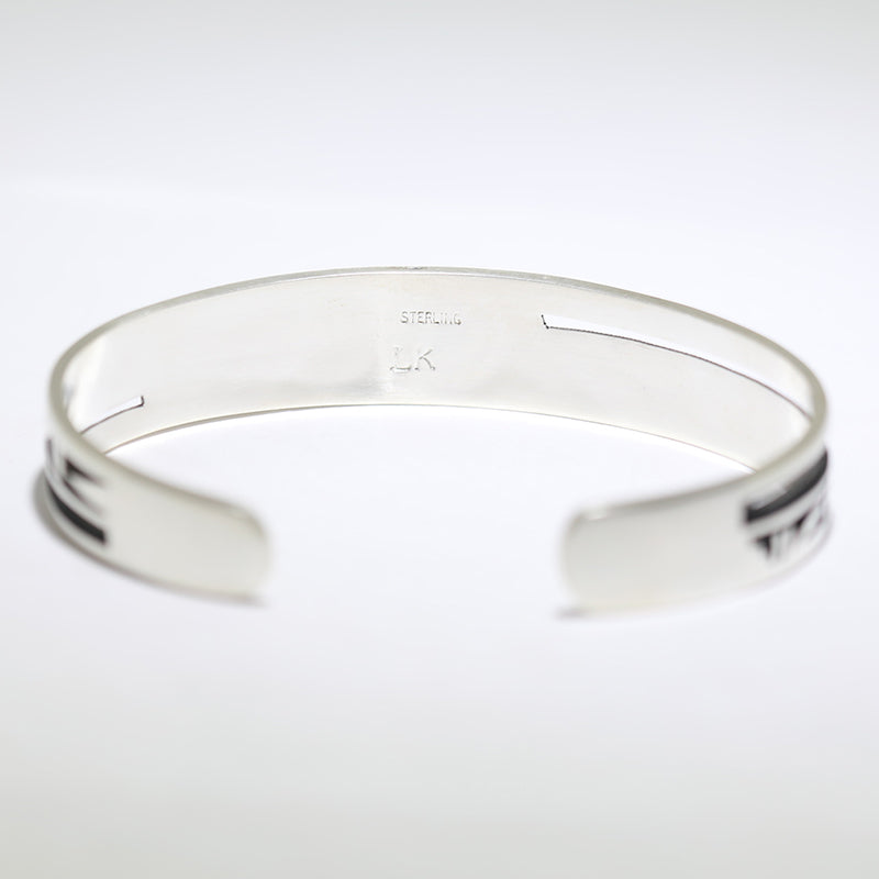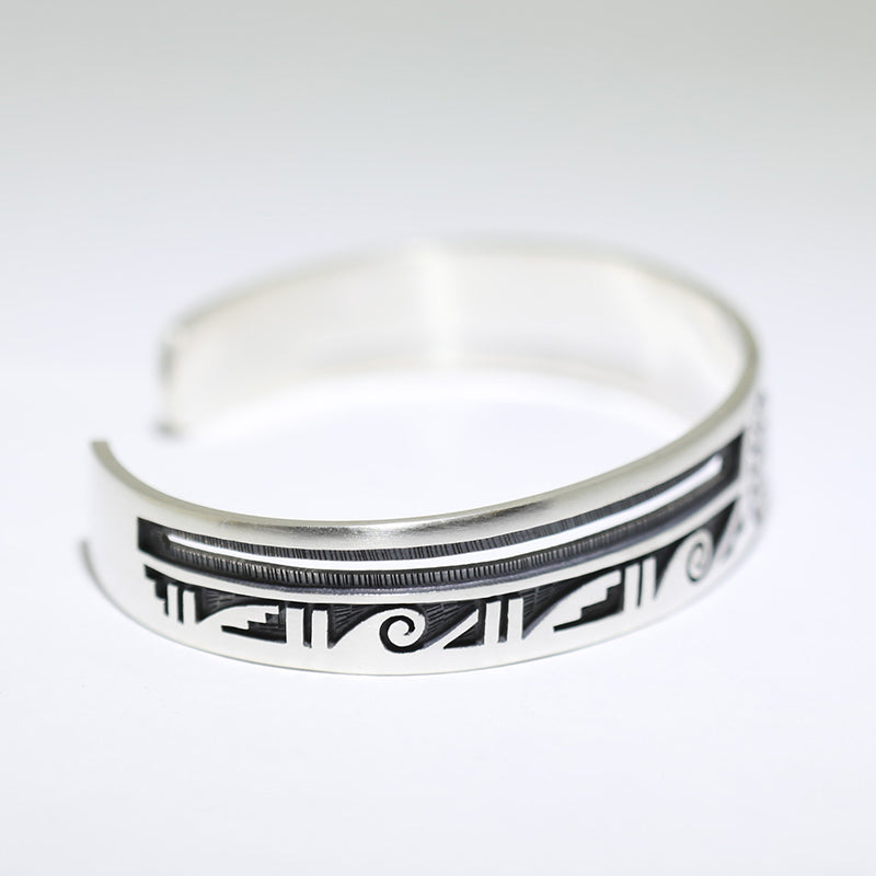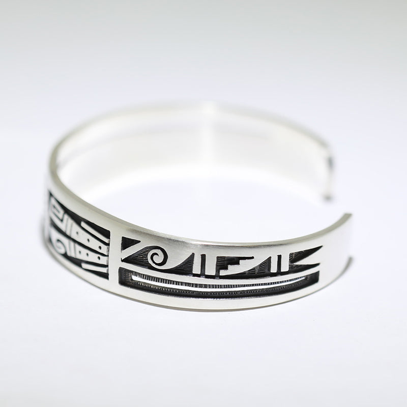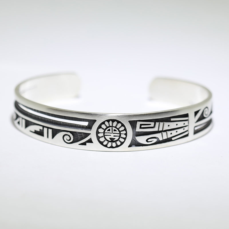 Beautiful sterling silver bracelet is done in the overlay technique and features the Sun Face in the center with Hopi designs on the sides. Each detail is cut by hand.