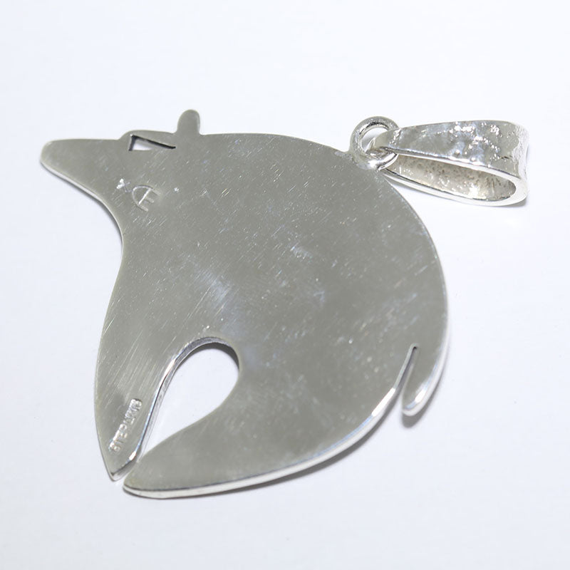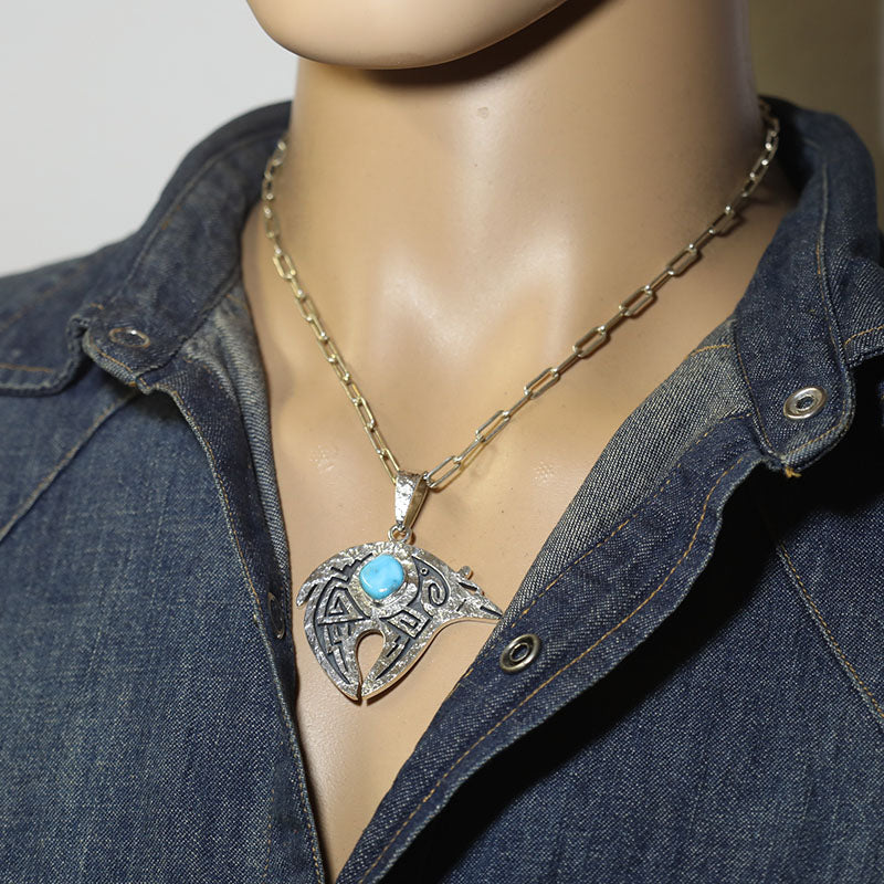 Beautiful sterling silver pendant is done in the overlay technique and shaped like a Bear with Hopi designs and is set with Blue Gem Turquoise.