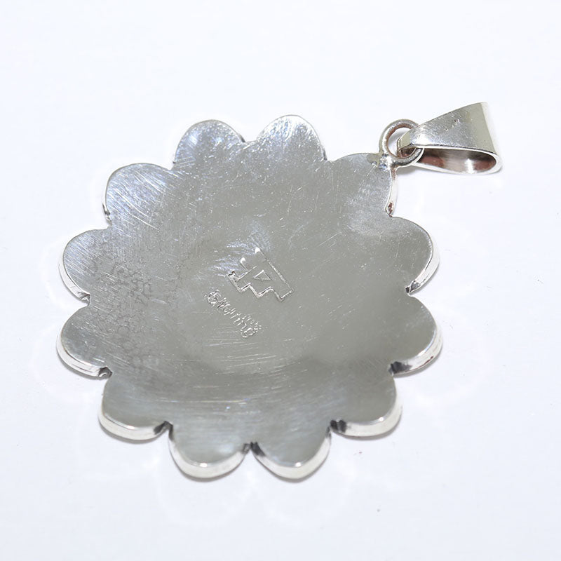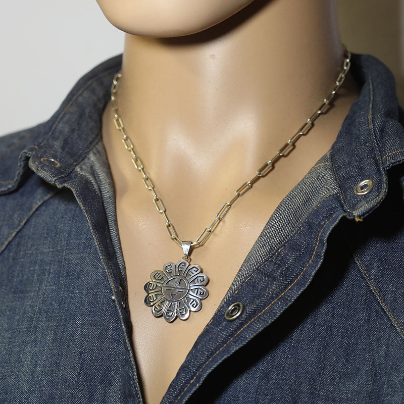 Sterling silver pendant is done in the overlay method and is shaped like the Sun Face with Hopi designs.