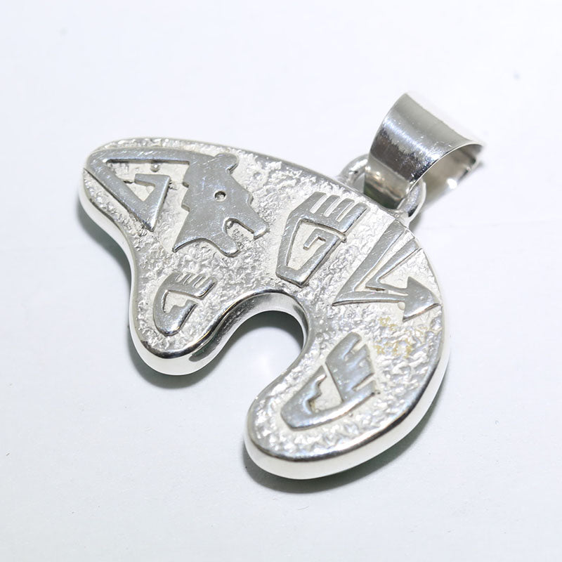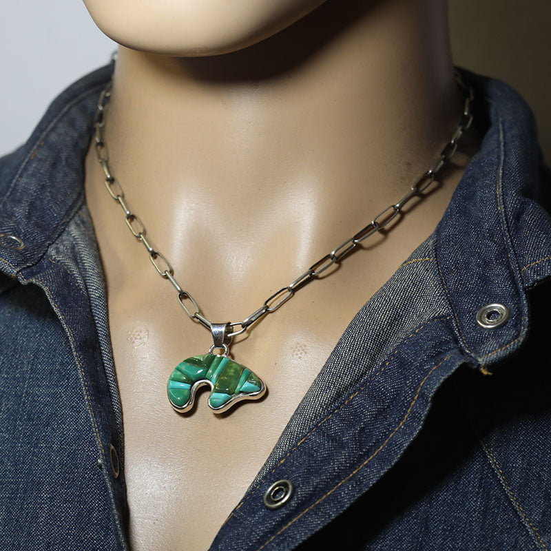 Sterling silver pendant is shaped like a Bear and depicts a Bear head and other symbols on one side and is inlaid corn row style with Sonoran Gold Turquoise on the reverse side.