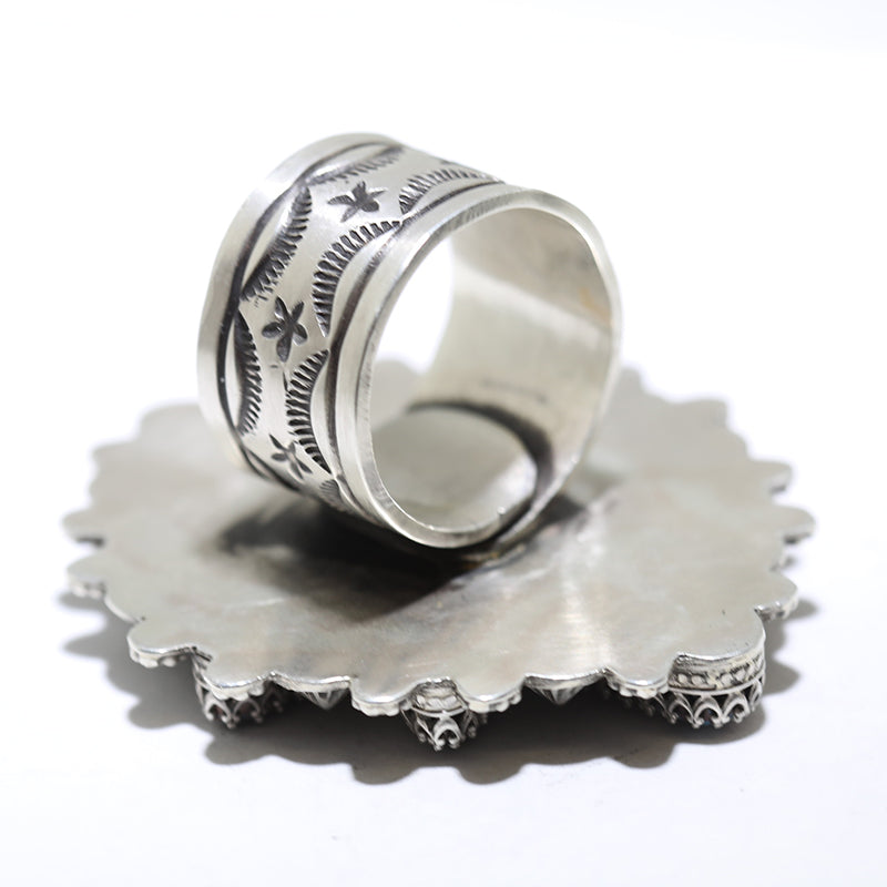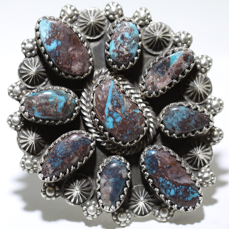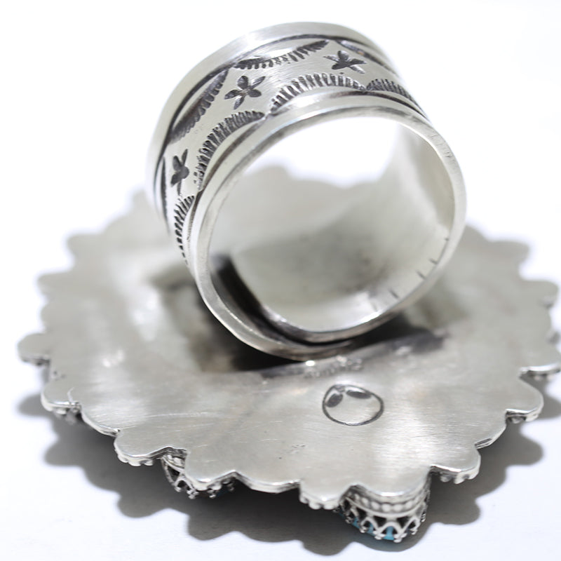 Sterling silver ring is shaped like a Flower and set with Bisbee Turquoise which has starbursts between each stone and hand stamped designs on the band.