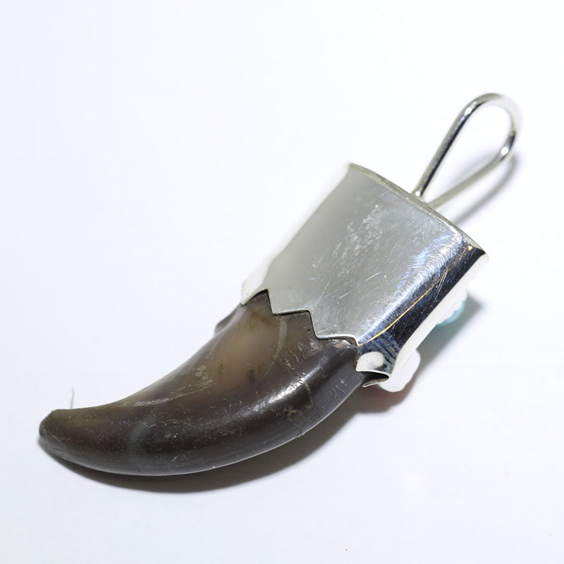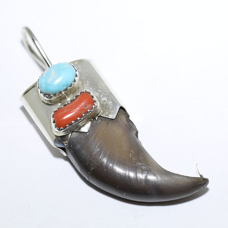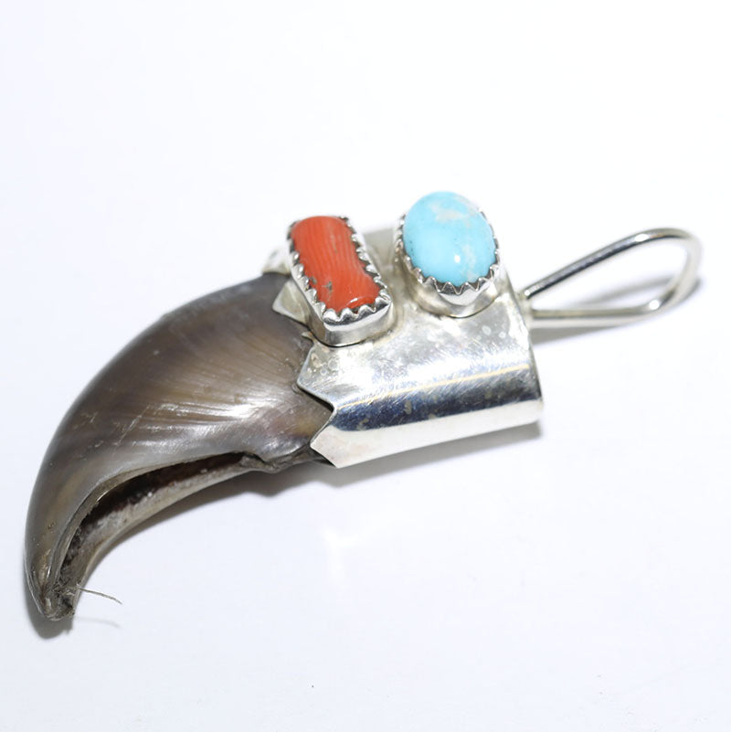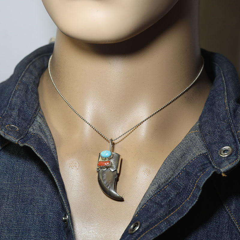 Sterling silver pendant is created using an Eagle talon and is set with both a Turquoise and Coral stone.