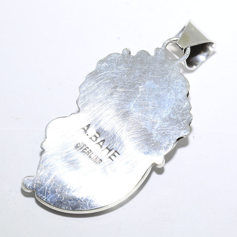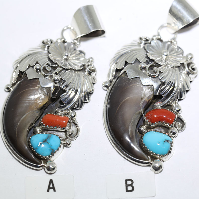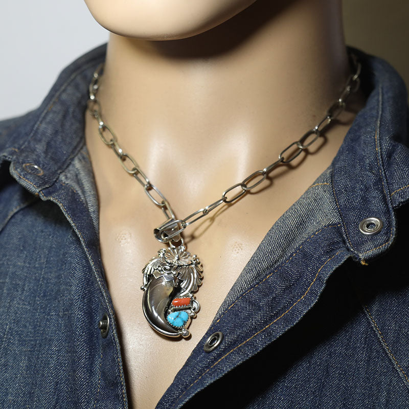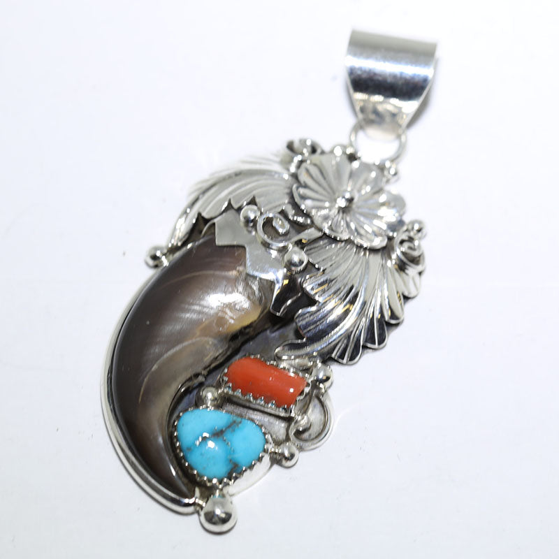 Sterling silver pendant is created with an Eagle talon and is set with both Coral and Turquoise stones.