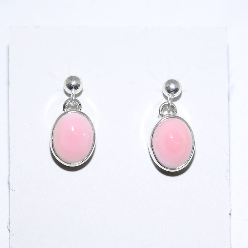 Sterling silver, post style earrings feature a silver bead at the top with Pink Conch Shell that dangles from it.