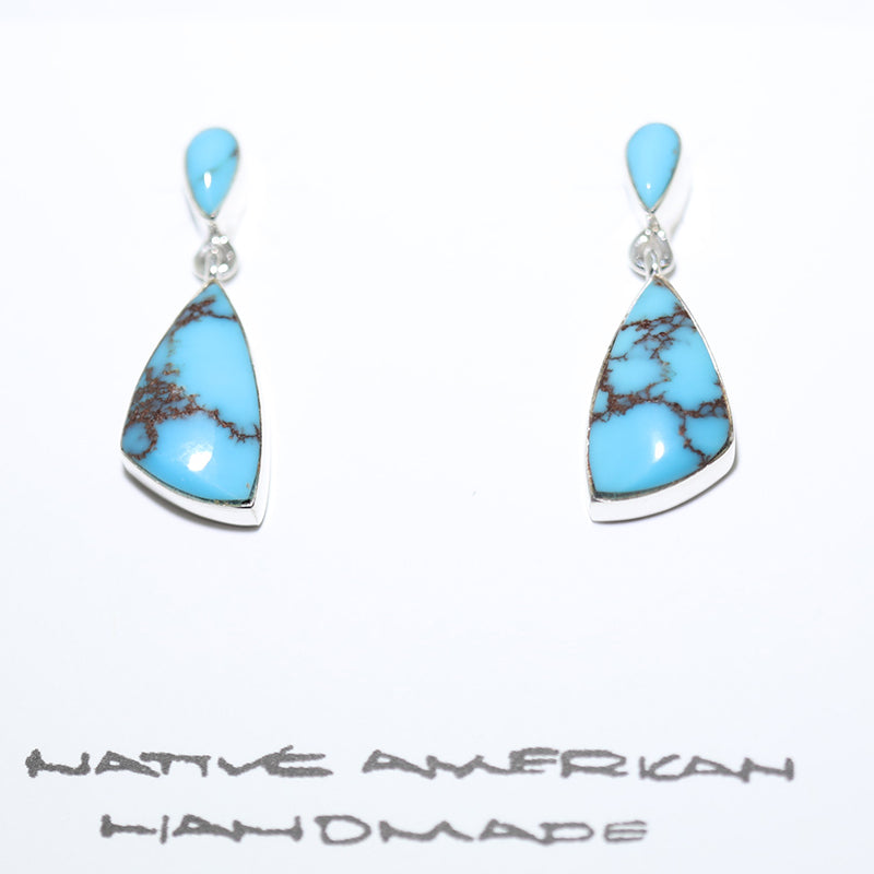 Sterling silver, post earrings are set with Stabilized Egyptian Turquoise at the top post with another larger stone dangling from it.