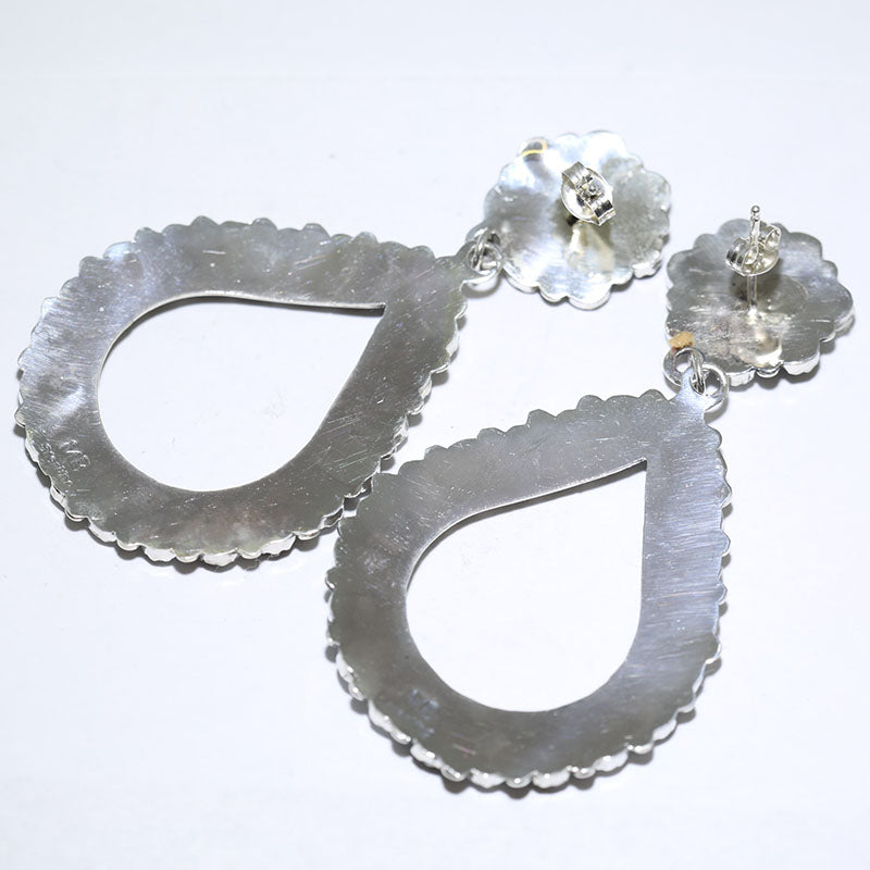 Sterling silver, post style earrings feature a cluster of stones at the top with a tear shaped hoop that dangles from it which is also set with stones. There is choice of either Turquoise stones or White Buffalo stones.
