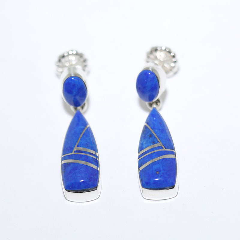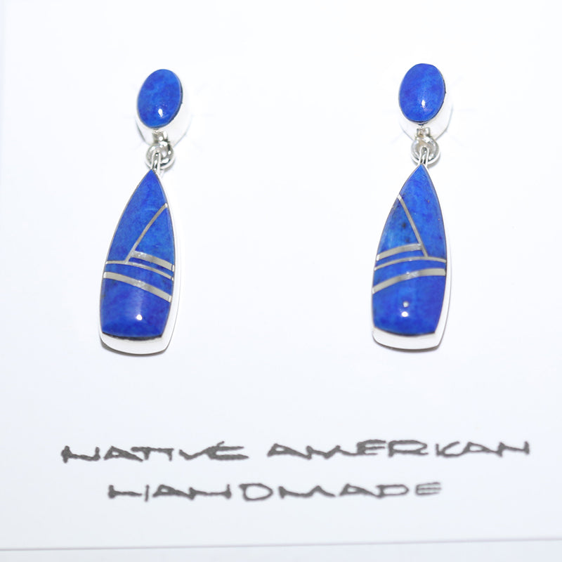 Sterling silver, post style earrings are inlaid with Lapis stones on both the post and the second piece which dangles from it.