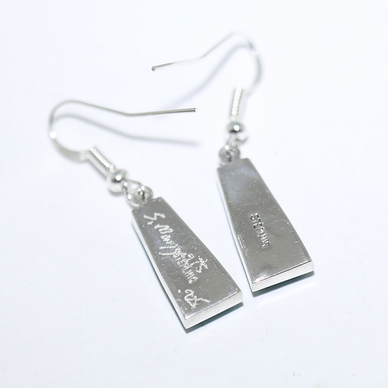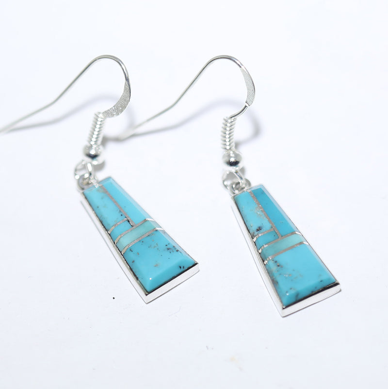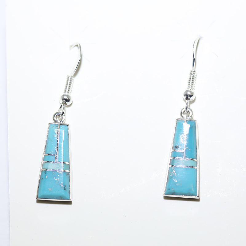 Sterling silver, hook style earrings are inlaid with Turquoise stones.