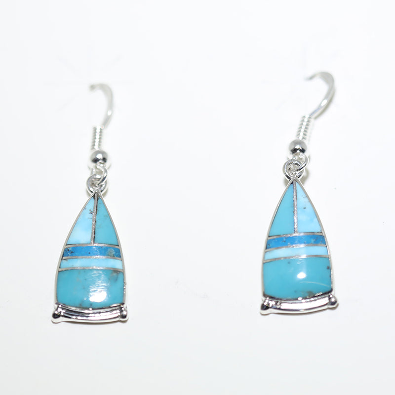 Sterling silver, hook style earrings are inlaid with Turquoise stones.