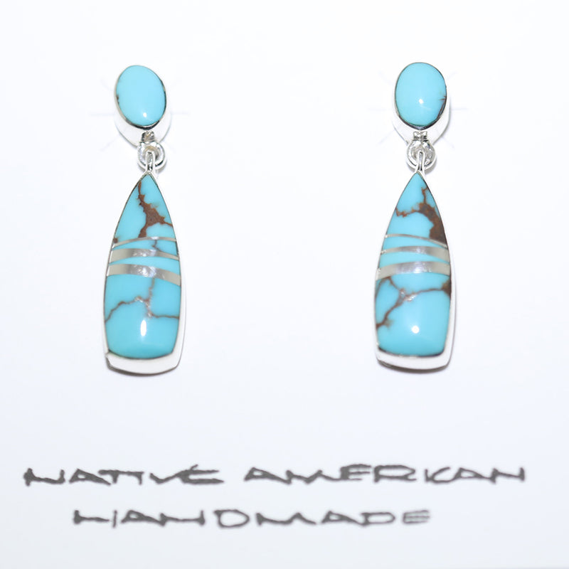 Sterling silver, post style earrings are inlaid with Stabilized Egyptian Turquoise on both the post and the second piece which dangles from it.
