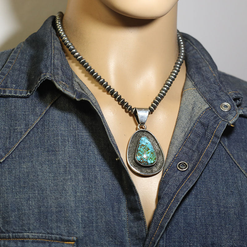 Sterling silver pendant is set with a large Stabilized Kingman Turquoise stone and has a silver channel which surrounds the stone.