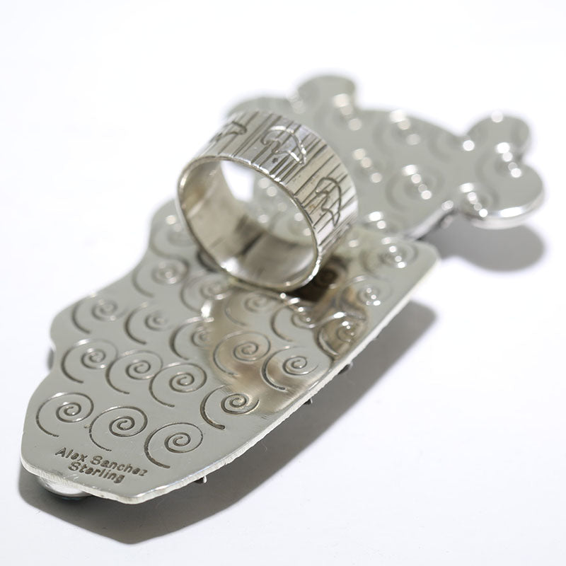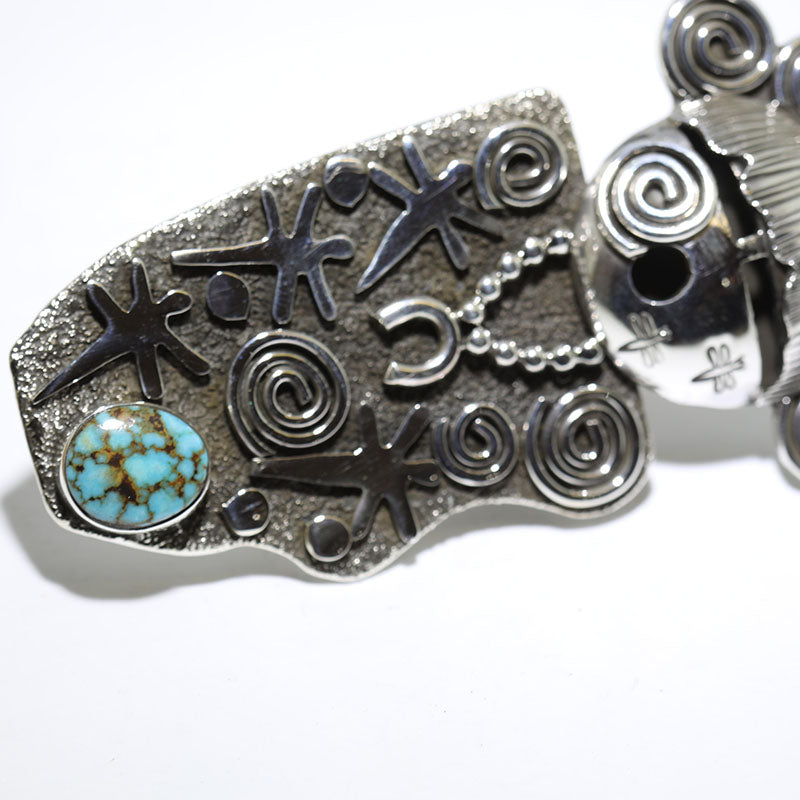 Alex was born in 1967 and is half Navajo and half Zuni. He learned to silversmith from his brother-in-law, Myron Pantewa. Alex's petroglyph designs come from Chaco Canyon. All of the designs and figures have meanings from over 1,000 years ago. Their ancestors left a lot of messages for us.