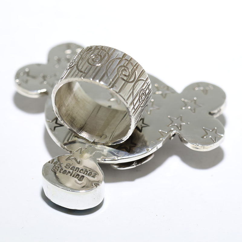 Beautiful sterling silver ring features the Maiden design with petroglyph designs and flowers on the cheek and is set with Stabilized Kingman Turquoise.