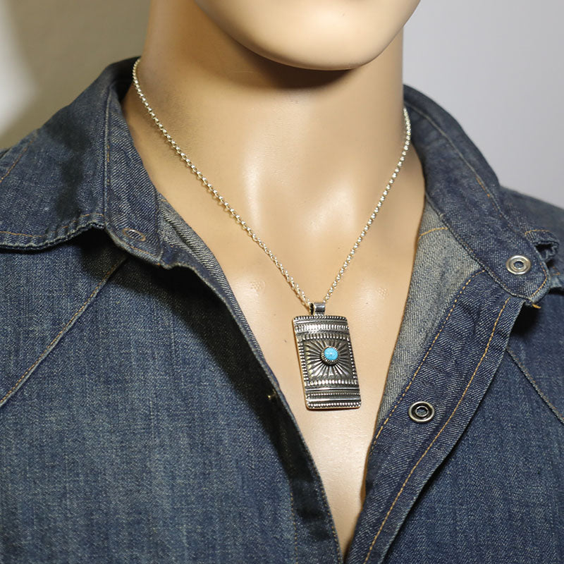 Sterling silver, rectangle shaped pendant is set with Lone Mountain Turquoise and features detailed hand stamped designs.