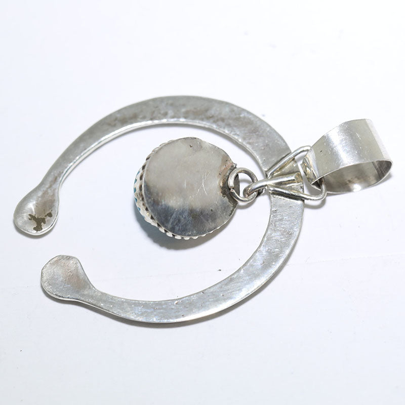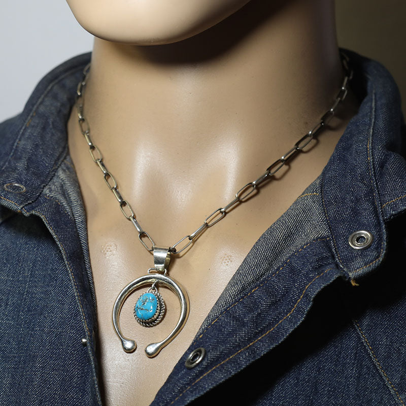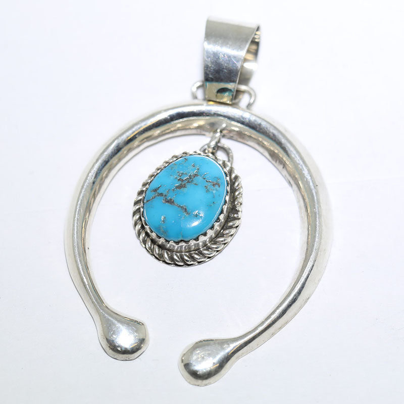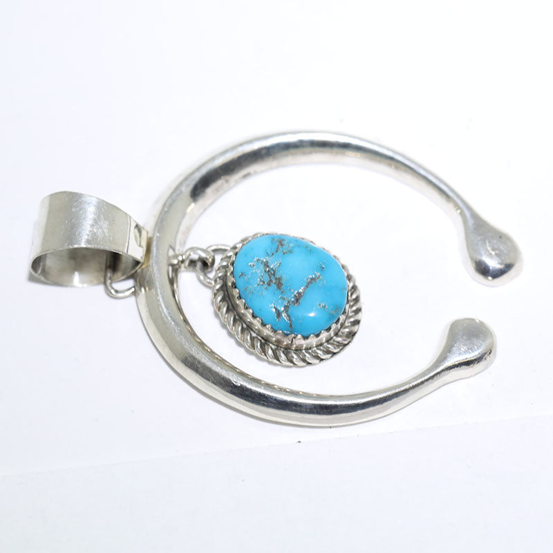 Sterling silver pendant is Naja shaped and set with a Turquoise stone which dangles from the center.