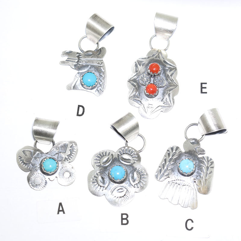 Sterling silver pendants feature different shapes which are set with either Turquoise or Coral stones which you can choose from.