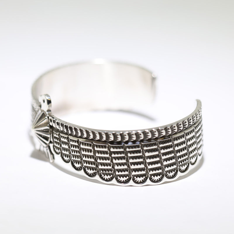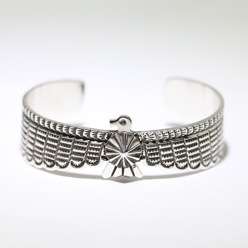 Sterling silver bracelet features the Thunderbird in the center with beautiful and detailed hand stamped designs along the band which is designed as the wings.
