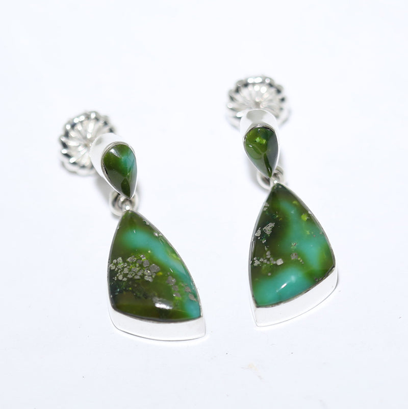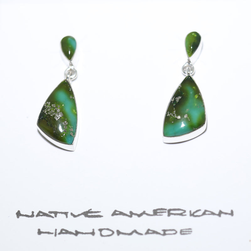 Sterling silver, post earrings are set with Sonoran Gold Turquoise at the top post with another larger stone dangling from it.