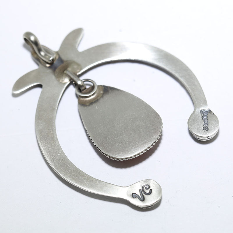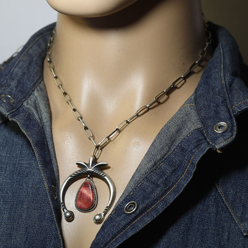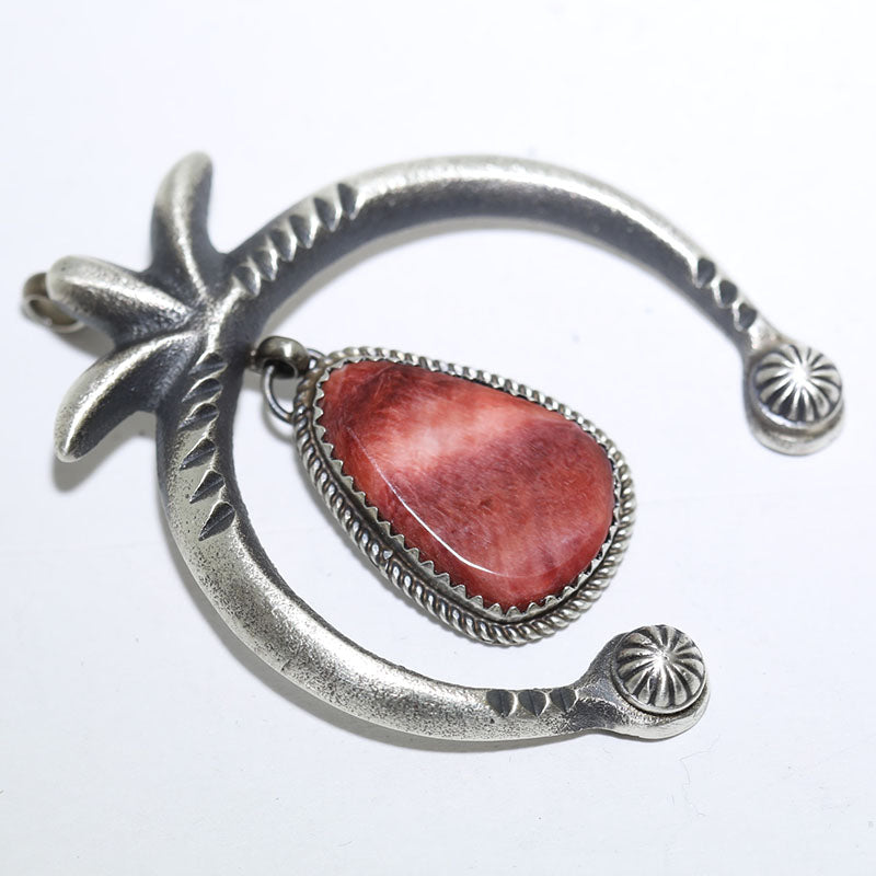 Sterling silver pendant is Naja shaped and set with Red Spiny Oyster Shell which dangles from the center.