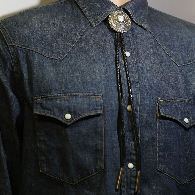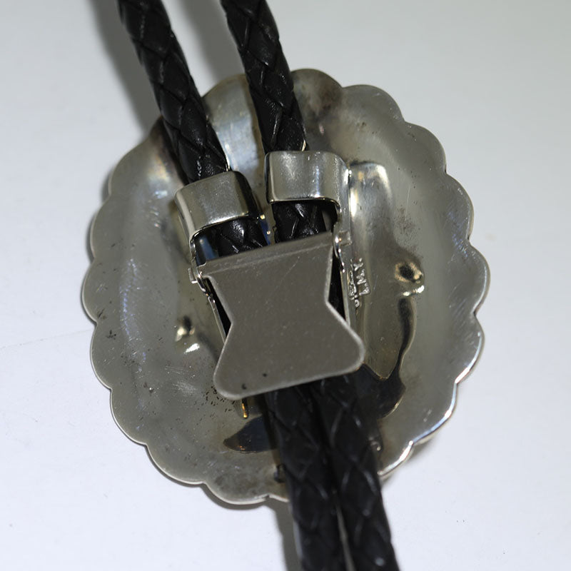 Sterling silver bolo is concho shaped with hand stamped designs and bump outs and is set with White Buffalo stone.