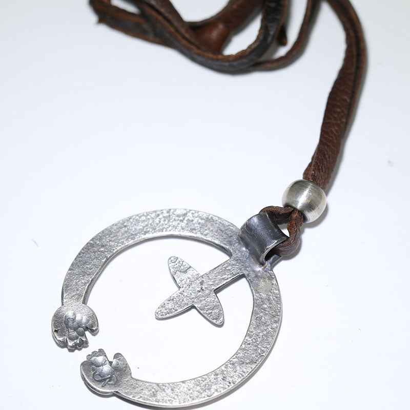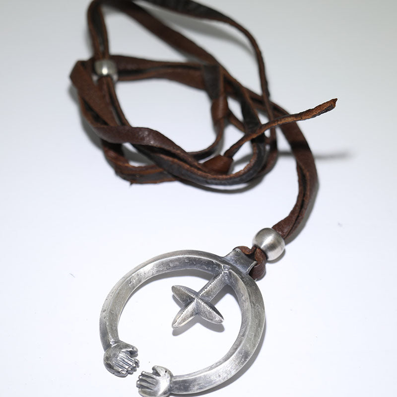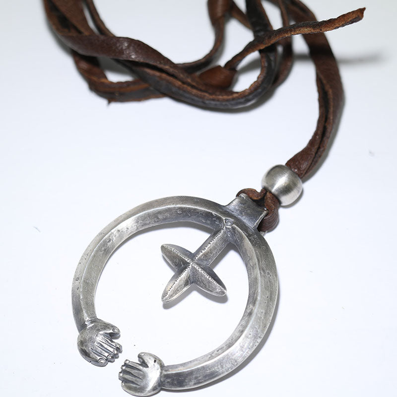 Coin silver pendant is Naja shaped with a star in the center with a hand at each end which hangs from brown leather.