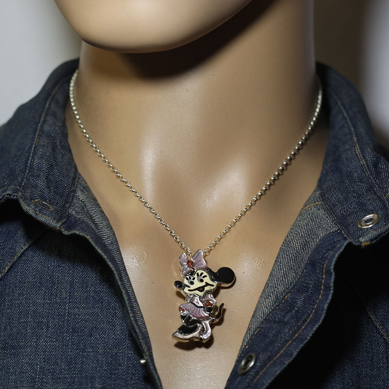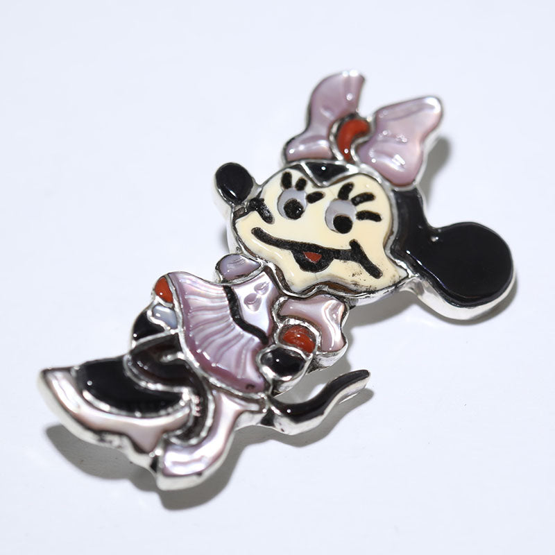 Sterling silver pendant is shaped like a Mouse with a Pink dress and inlaid with a colorful combination of stones. This item can also be worn as a pin.