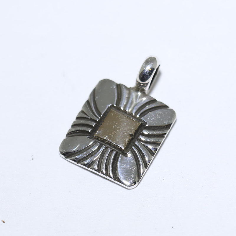 Sterling silver pendant is square shaped with 18-karat gold in the center and hand stamped designs along the edges.