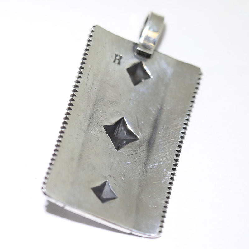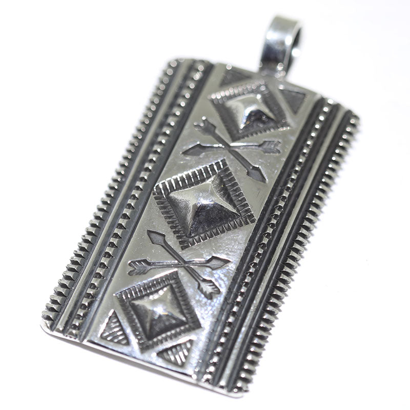 Sterling silver pendant features hand stamped crossed arrows and edges with three diamond bump outs in the center.