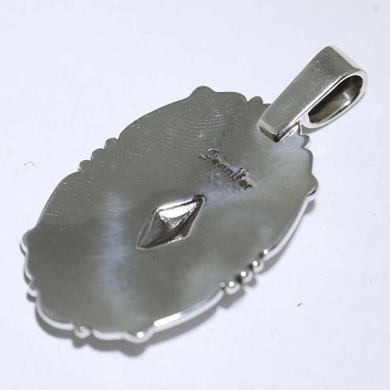Sterling silver pendant is oval shaped and features beautiful overlay and hand stamped designs.