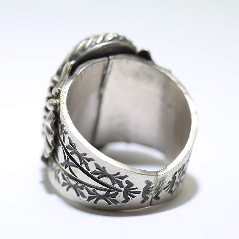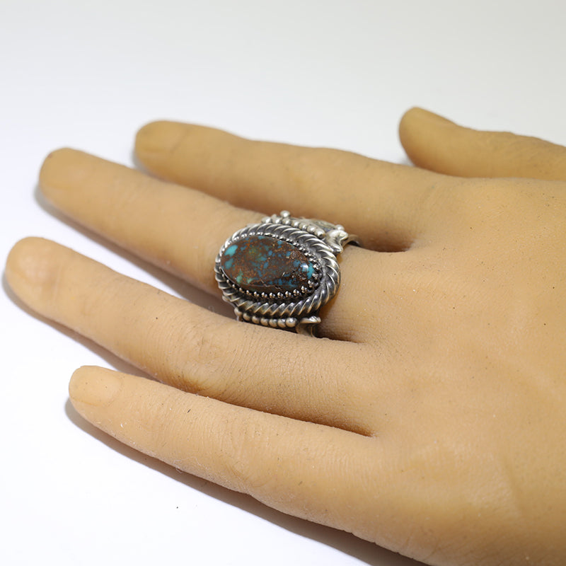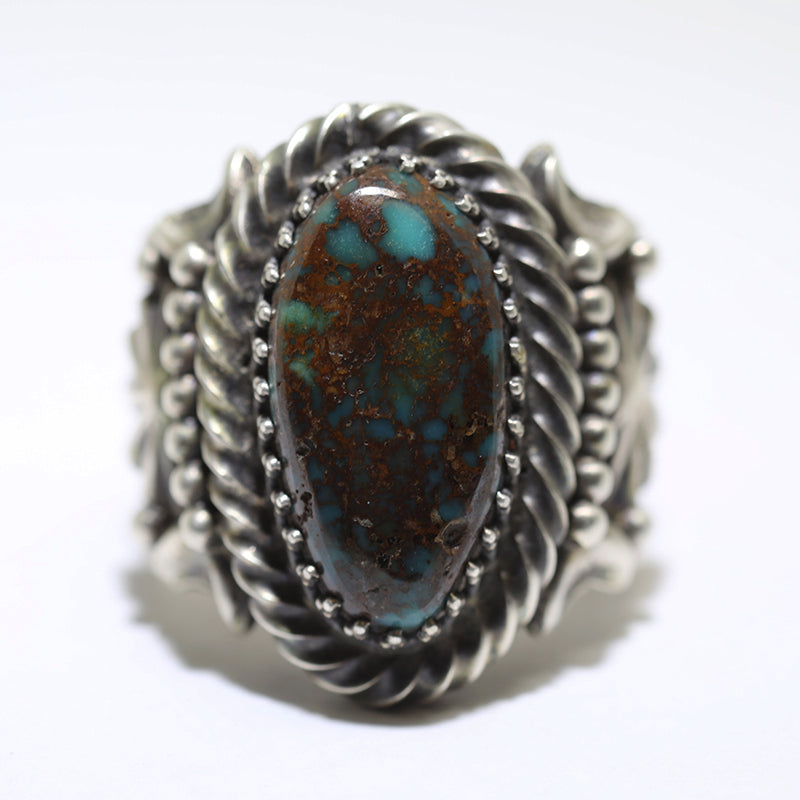 Sterling silver ring features beautiful silverwork with hand stamped designs and is set with Stabilized Bisbee Turquoise.