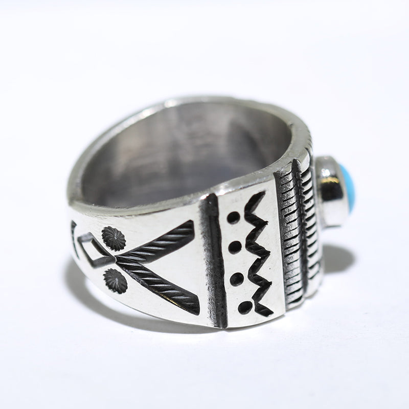 Sterling silver ring is set with Natural Bisbee Turquoise in the center with hand stamped designs along the band.
