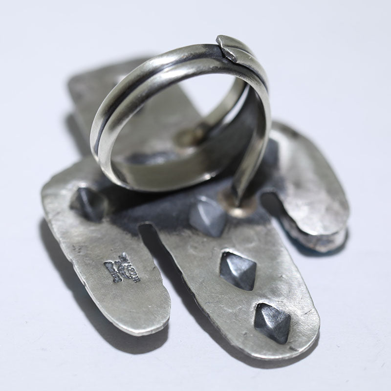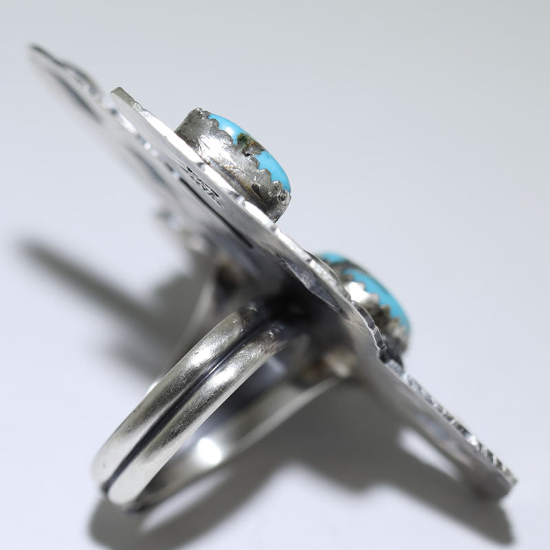 Sterling silver ring is shaped like a Cactus which features hand stamped designs and bump outs and is set with Turquoise stones.