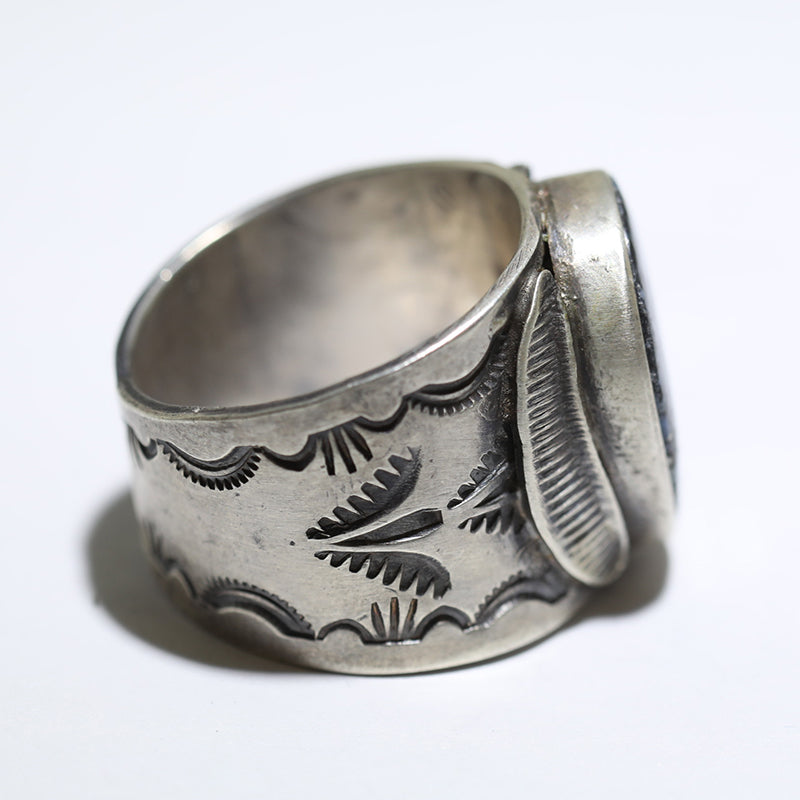 Sterling silver ring features hand stamped designs and is set with zebra Calcite.