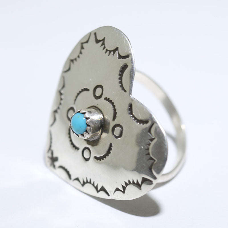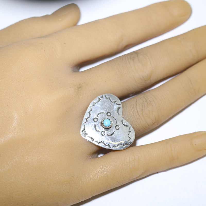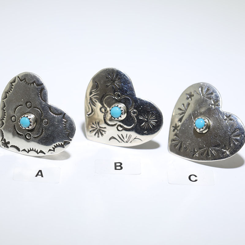 Sterling silver, heart shaped ring is set with Sleeping Beauty Turquoise and features different hand stamped designs to choose from.