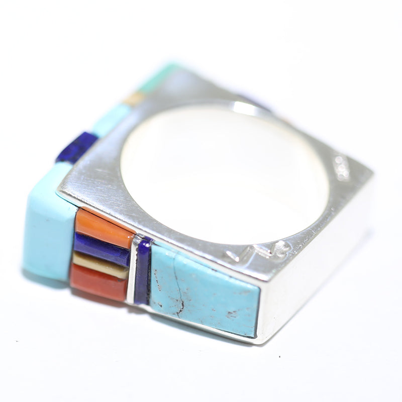 Sterling silver ring is inlaid with a variety of colorful stones including Royston Turquoise both on top and on the sides of the ring.