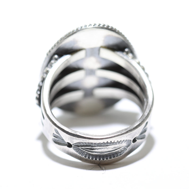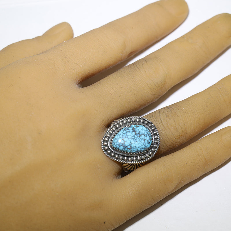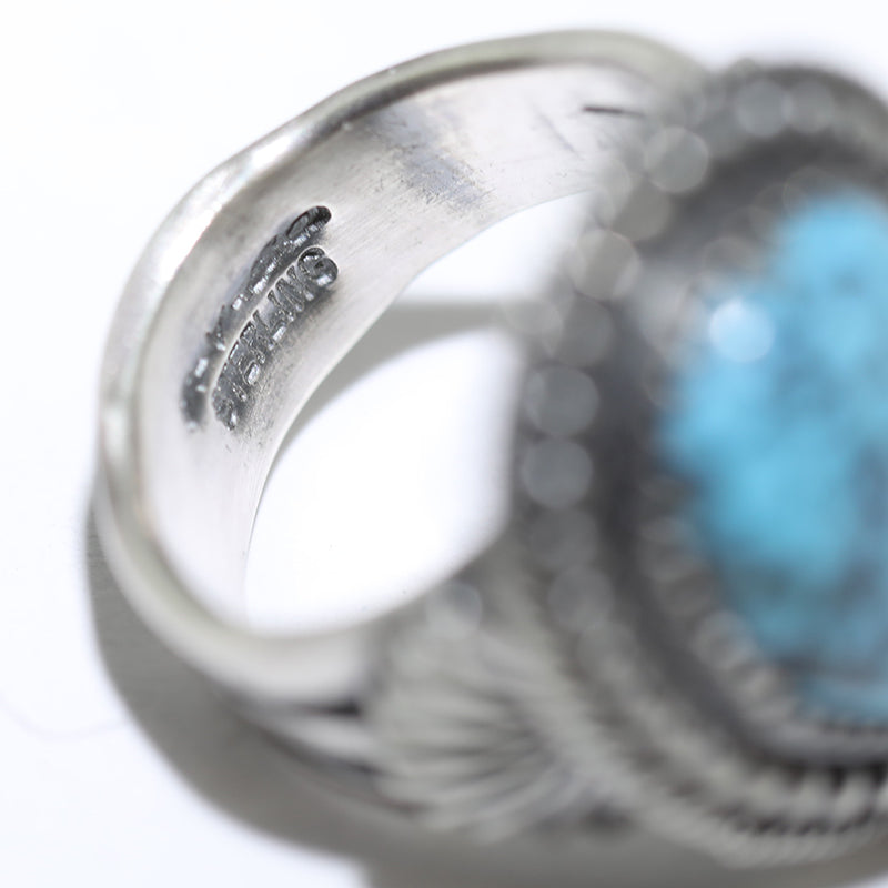 Beautiful sterling silver ring is set with Ithaca Peak Turquoise which is surrounded by bead wire and has hand stamped designs along the band.