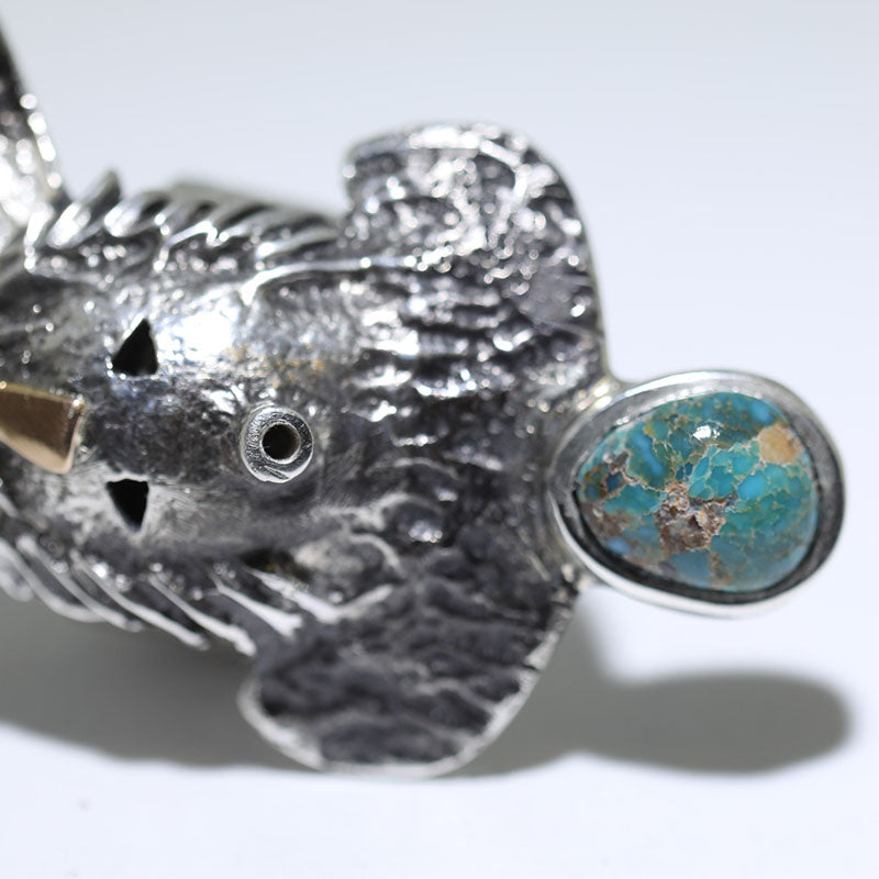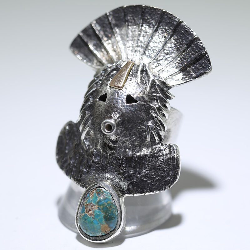 Sterling silver ring is shaped like a Kachina head which features 18-karat gold in the center of the headdress.